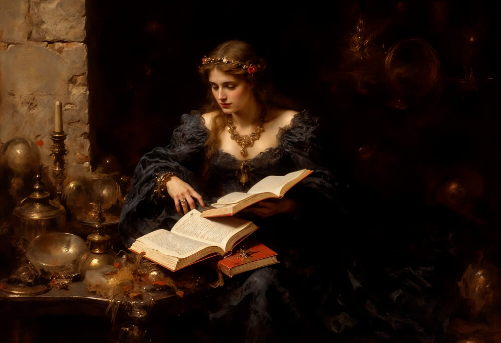 Девушка не просто стоит среди книг — она погружена в их мир. Одной рукой она бережно касается раскрытого фолианта, вторая лежит на груди, что может символизировать процесс познания, переходящий в глубокое внутреннее переживание. Книги, изображённые с фотографической детализацией, — ключевые аксессуары аллегории. Это не просто символы знания, а намёк на его преходящую ценность: одни фолианты роскошно переплетены, другие — потрёпаны, некоторые лежат закрытыми, а иные раскрыты на пожелтевших страницах. Они олицетворяют накопленную человеческую мудрость, которая, однако, бессильна перед лицом вечности.