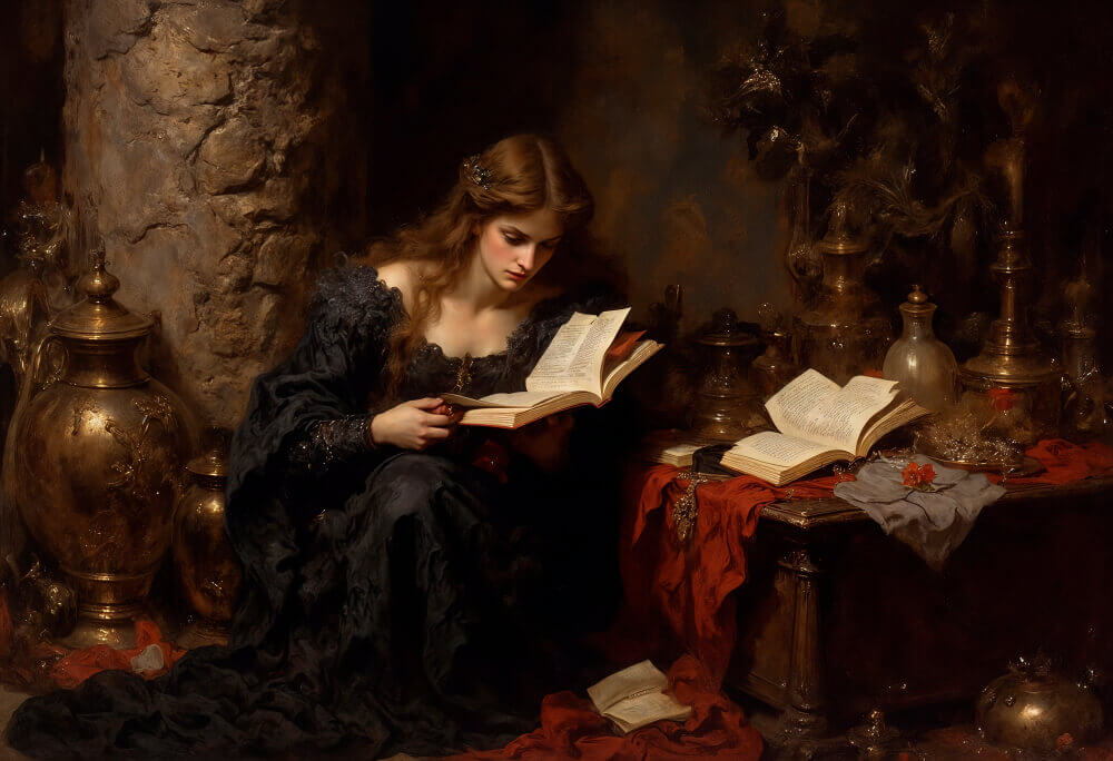 Центральной фигурой композиции является молодая девушка, одетая в строгое чёрное платье из бархата или тяжёлого шёлка. Её наряд, лишённый каких-либо украшений, и бледное, почти мертвенно-хладное лицо сразу задают настроение сосредоточенной меланхолии. Художник использует приём «кьяроскуро» (резкой светотеневой моделировки): яркий, направленный луч света, будто из невидимого окна, выхватывает из кромешной тьмы её лицо, руки и верхние части стопок книг. Этот свет не утешает, а лишь подчёркивает драматизм сцены, создавая ощущение театральной, почти мистической вневременности.