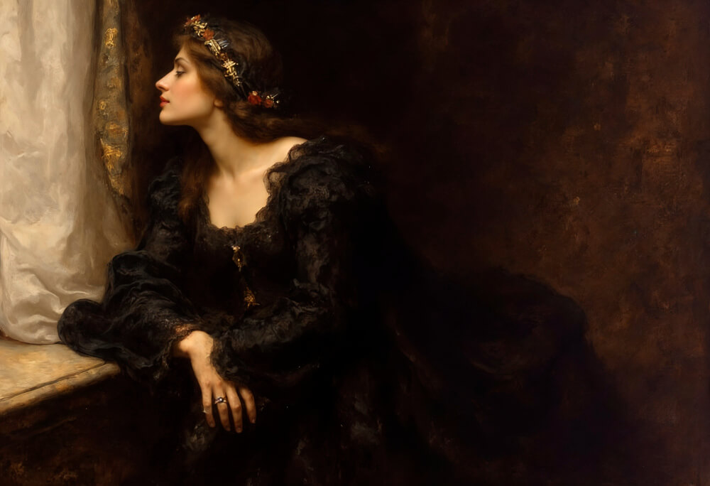 Центральной фигурой композиции является молодая девушка, одетая в строгое чёрное платье из бархата или тяжёлого шёлка. Её наряд, лишённый каких-либо украшений, и бледное, почти мертвенно-хладное лицо сразу задают настроение сосредоточенной меланхолии. Художник использует приём «кьяроскуро» (резкой светотене...